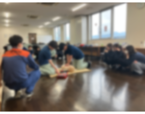 前半は動画を見ながら解説を聞く座学講習、後半は実際にダミー人形を使って心肺蘇生法やAED(自動体外式除細動器)の使用方法を学びました。